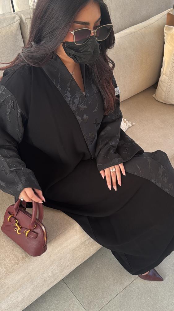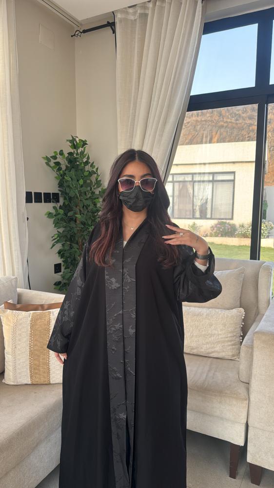 العباية مصممة بقصة عادية كلاسيكية تمنحك إطلالة راقية ومحافظة، مزينة بياقة وتفاصيل أكمام من قماش الجاكار المشجّر، الذي يضيف لمسة فنية فاخرة تبدأ من الكتف وتمتد حتى أطراف الكم.