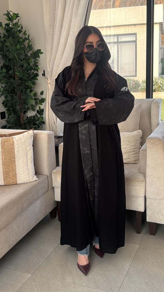 🖤 لمسات الجاكار المشجّر على الياقة والأكمام تضيف للعباية بعداً بصرياً جذاباً، مثالية للمناسبات الرسمية والمشاوير اليومية الأنيقة.